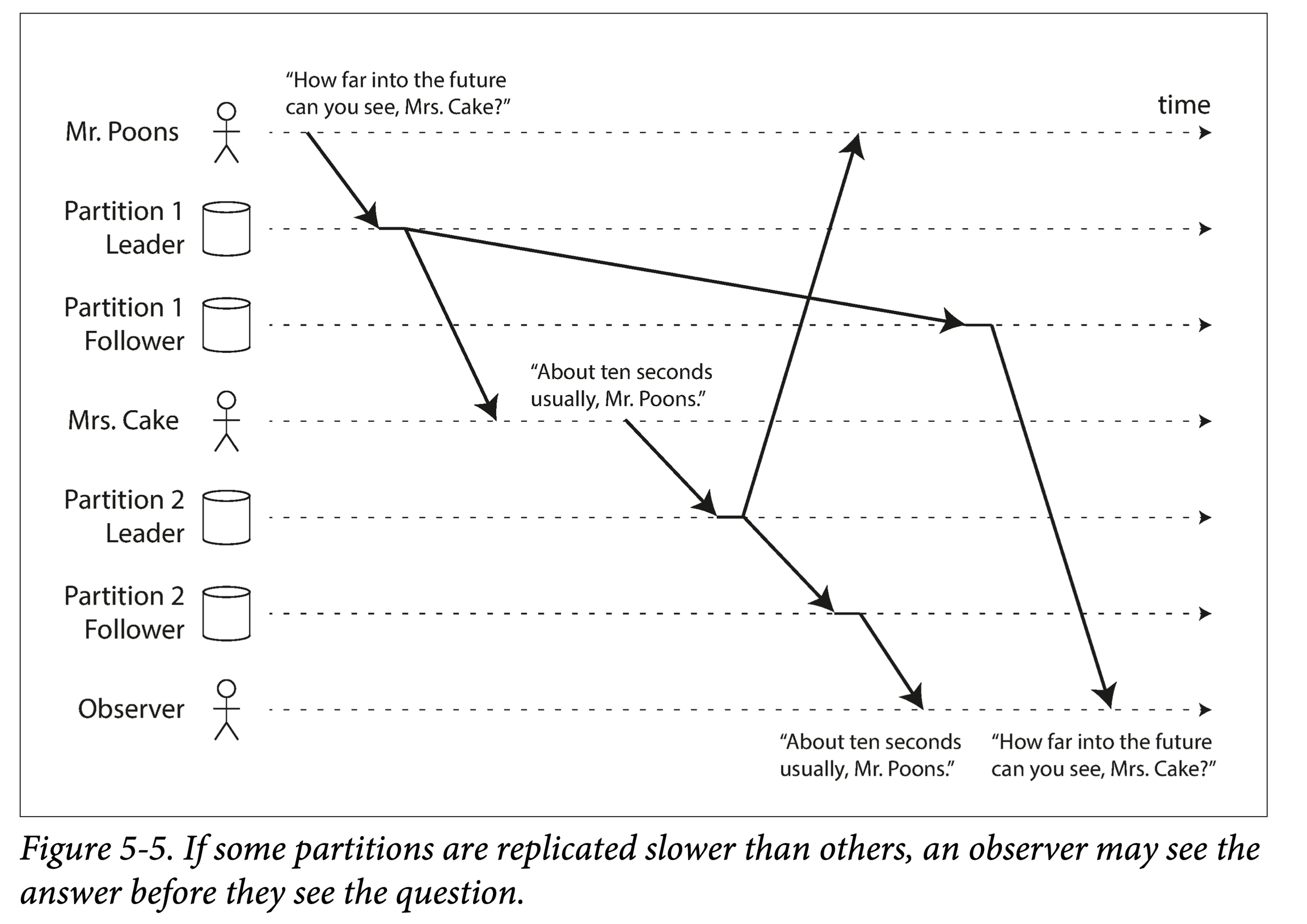 如果数据库由多个分区(Partition)组成,分区间的事件顺序无法保证,如果有因果关系的两个事件落在了不同分区,则有可能会出现果在前,因在后。