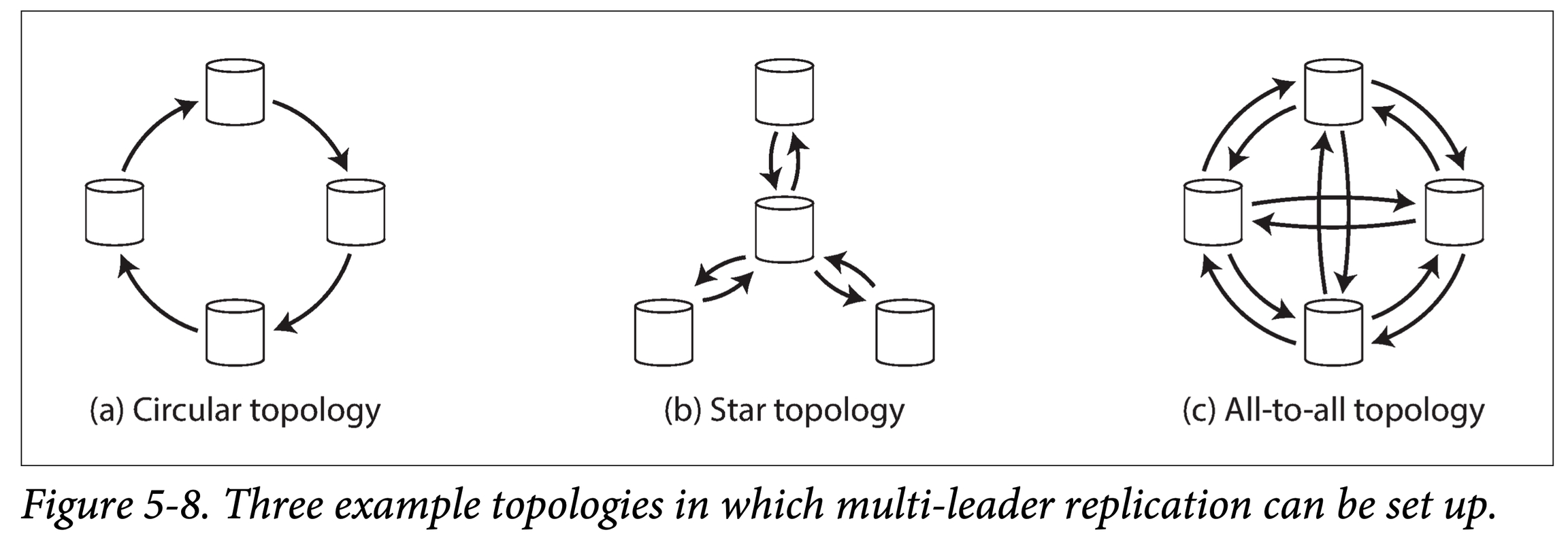 复制拓扑(replication topology)描述了数据写入从一个节点到另一个节点的传播路径。下图表示了 ≥ 4 个主副本时,常见的复制拓扑: