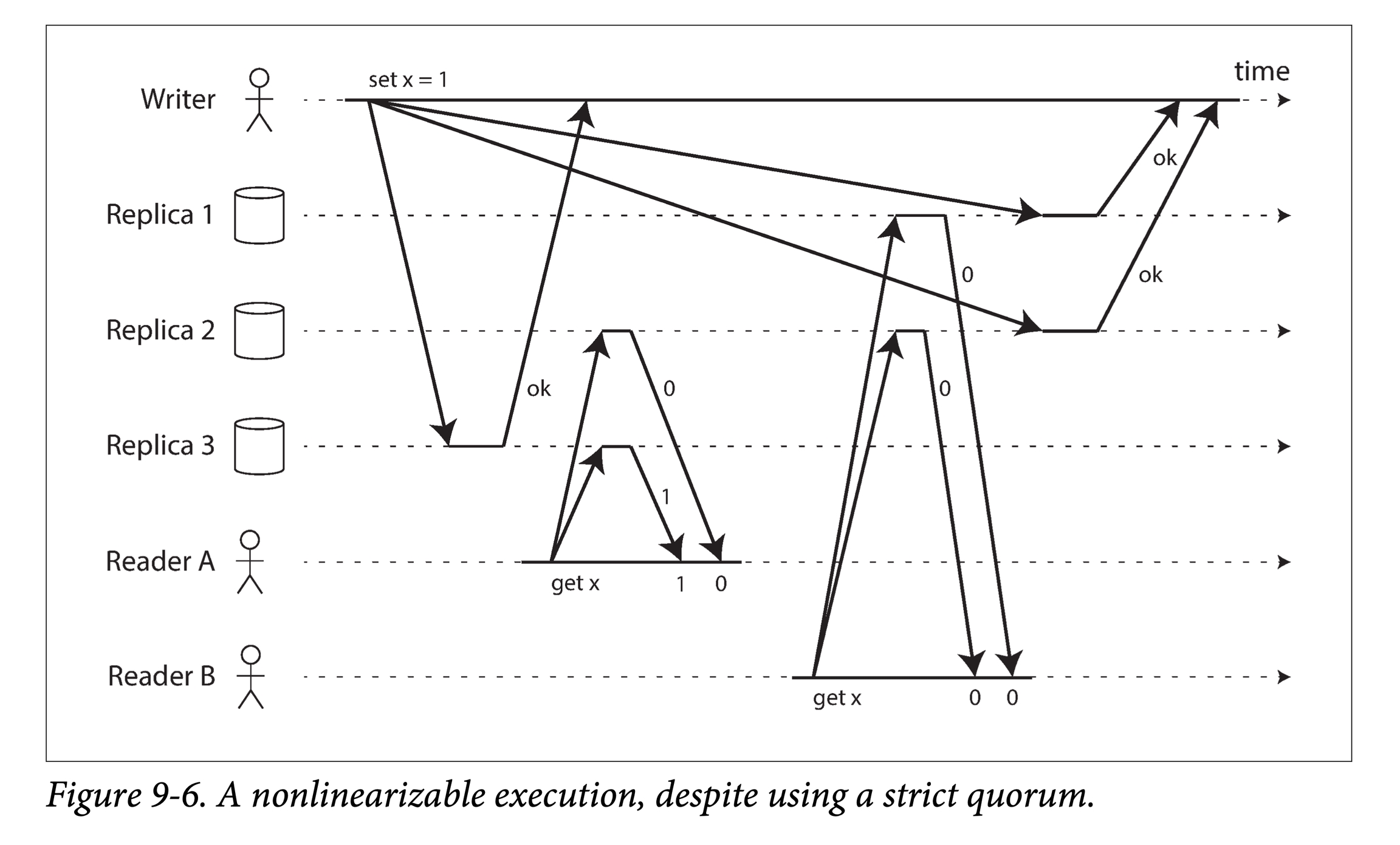 基于主副本的模型,在有副本故障时,需要进行故障切换。在无主模型中,简单忽略它就行。在读取时,同时读取多个副本,选取最新版本的值。如果副本总数为 n,写入 w 个副本才认定写入成功,并且在查询时最少需要读取 r 个节点。只要满足 w + r > n,我们就能读到最新的数据(鸽巢原理)。此时 r 和 w 的值称为 quorum 读写。当然也存在一些corner case,如: