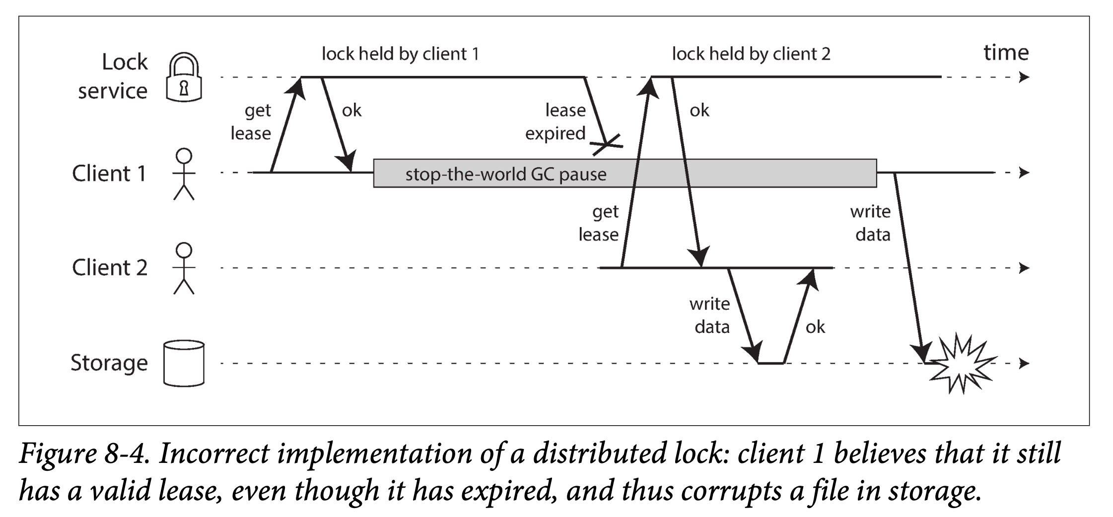 在锁服务每次授予锁或者租约时,会附带给一个防护令牌(fencing token),拒绝携带过期令牌的请求。即,关联了ID的锁服务。