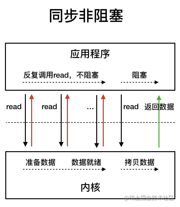 也就是说,在内核数据没有准备就绪时,应用可以轮询是否就绪(而不是阻塞等待)。得到是就绪后,就阻塞等着从内核把数据进行拷贝。