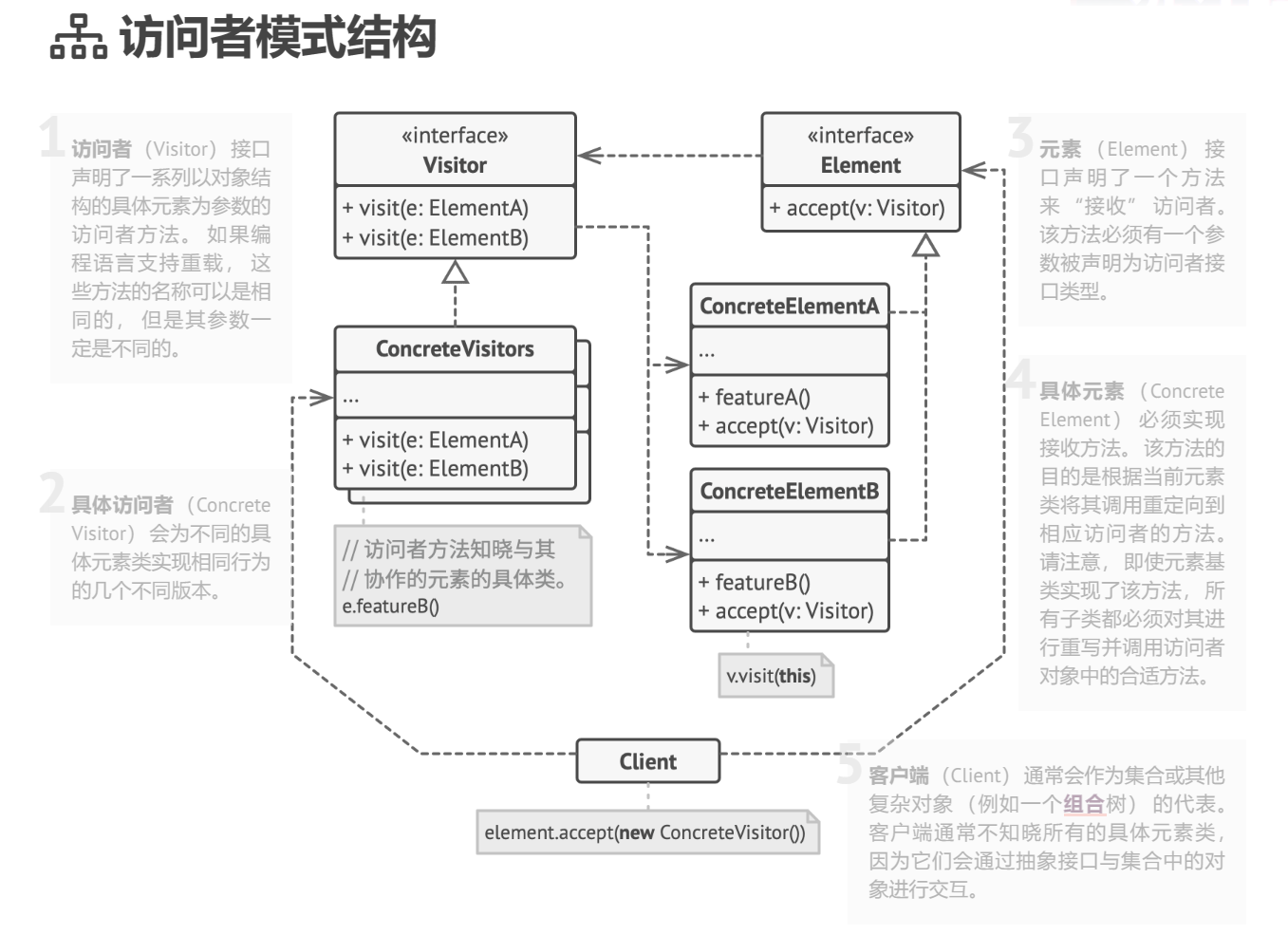 访问者模式建议将新行为放入一个名为访问者 的独立类中,而不是试图将其整合到已有类中。访问者类可以定义一组 (而不是一个) 方法, 且每个方法可接收不同类型的参数,需要执行操作的原始对象将作为参数被传递给访问者中的方法 ,让方法能访问对象所包含的一切必要数据。