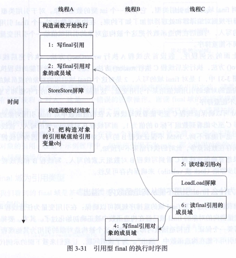 如果final为引用类型呢?对于引用类型,写final域的重排序规则对编译器和处理器增加了如下约束:在构造函数内对一个final引用的对象的成员域的写入,与随后在构造函数外把这个被构造对象的引用赋值给一个引用变量,这两个操作之间不能重排序。