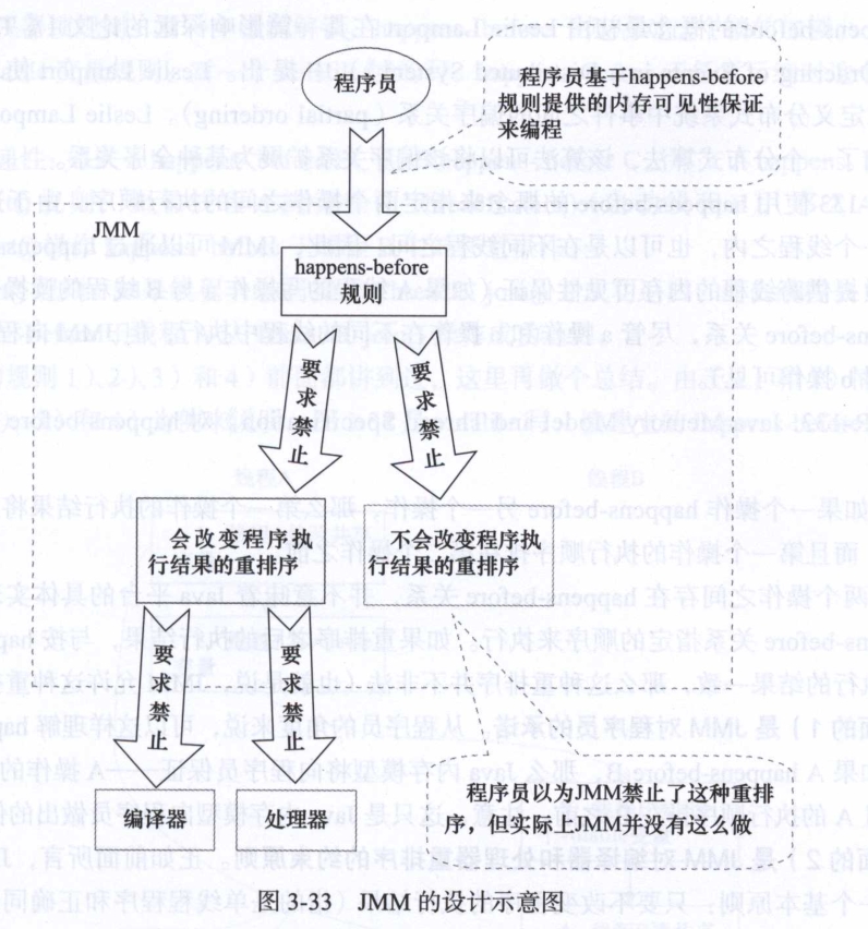根据顺序一致性模型,所有操作完全按程序的顺序串行执行。而在JMM中,临界区内的代码可以重排序(但JMM不允许临界区内的代码“逸出”到临界区之外,那样会破坏监视器的语义)。JMM会在退出临界区和进入临界区这两个关键时间点做一些特别处理,使得线程在这两个时间点具有与顺序一致性模型相同的内存视图。虽然线程A在临界区内做了重排序,但由于监视器互斥执行的特性,这里的线程B根本无法“观察”到线程A在临界区内的重排序。这种重排序既提高了执行效率,又没有改变程序的执行结果。