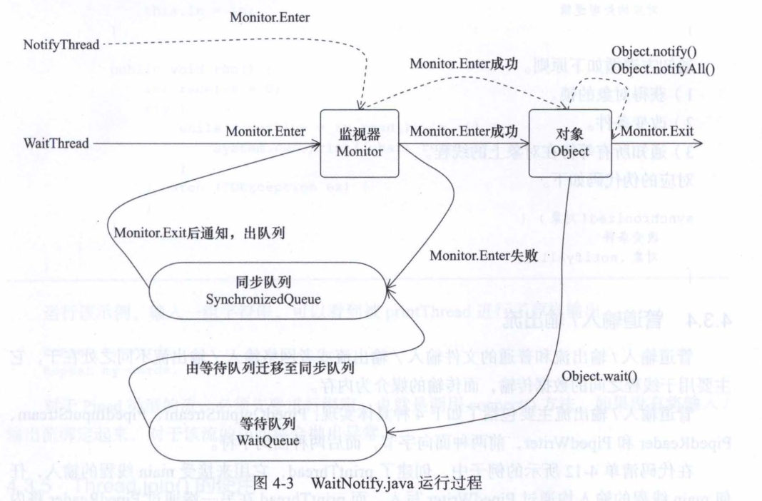 (this.)wait:当前线程暂停运行并进入调用者obj的等待队列中,释放锁。notify:唤醒等待队列中的其中一个(未定义)线程。notifyAll:唤醒等待队列中的所有线程。推荐使用。