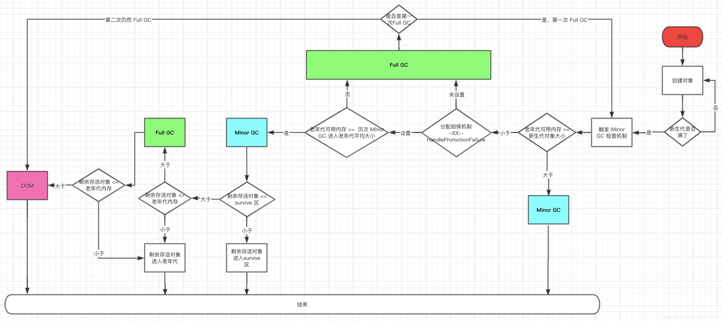 在发生 Minor GC 前,虚拟机检查老年代最大可用的连续空间是否大于新生代所有对象总空间,否则不安全,检查配置是否允许失败,是则尝试着进行一次 Minor GC,否则进行一次 Full GC。