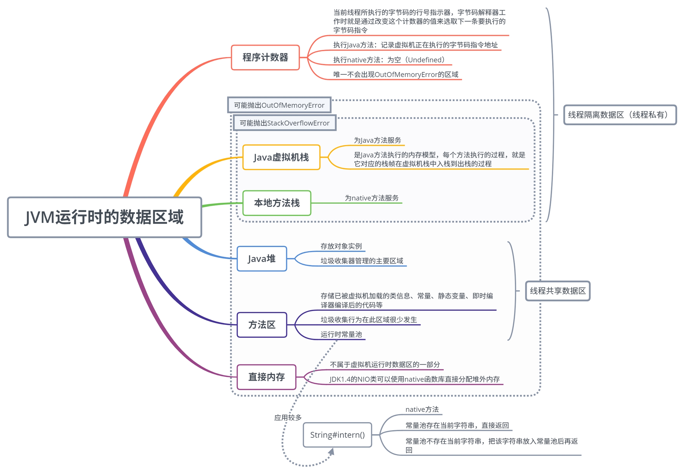 方法区:线程共享,存储类型信息、静态变量等。运行时常量池是其中的一部分。