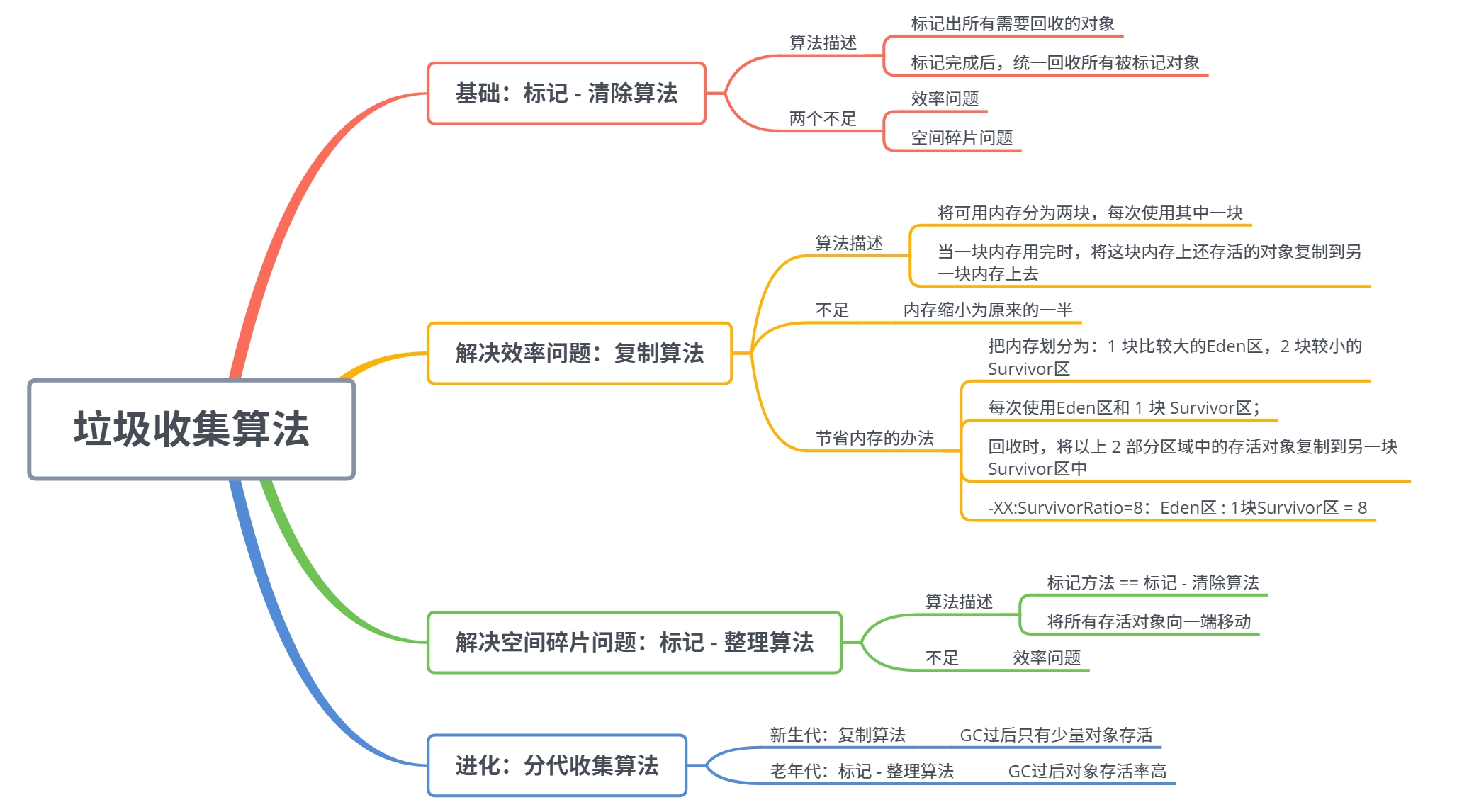 该算法是基础。先标记出所有需要回收的对象,标记完后,统一回收所有被标记对象。存在:碎片化、效率低的缺点。