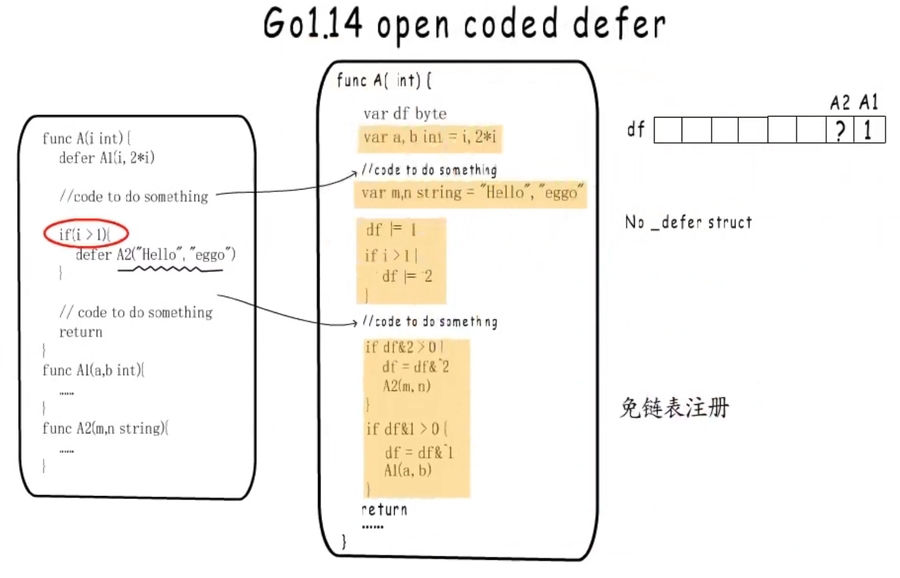 Go 1.14 采用df变量,按位表示是否需执行和被执行(需要实时条件判断等情况),并使用插入代码的方式进行defer机制。循环中的defer依然需要使用1.12版本的链表机制。