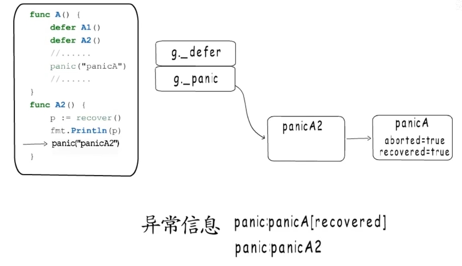 panic后执行(非注册)的defer,defer中的panic会指向该panic。执行方式:先标记,后释放,目的是为了终止之前发生的panic。也就是说,执行时再次发生panic,插入新panic,而defer中的_panic不是它,标记对应的defer._panic为已终止。