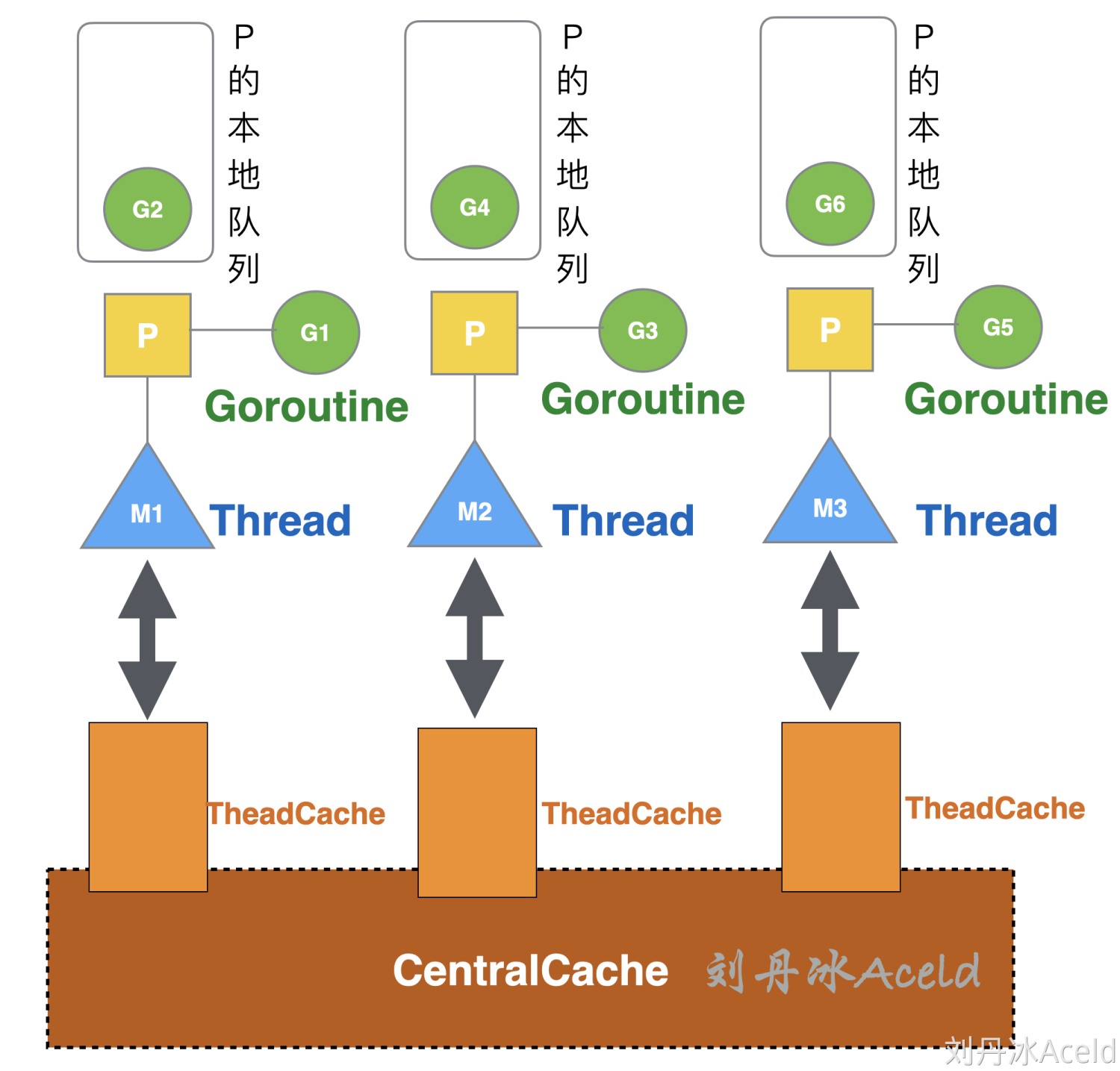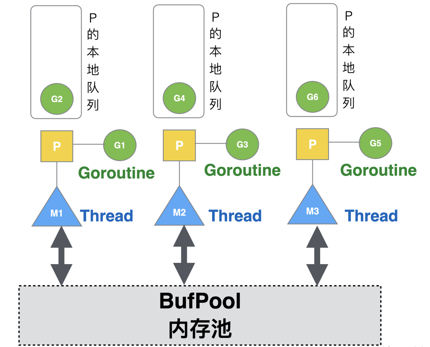 Go 语言中,协程对应的数据结构是runtime.g,工作线程对应的数据结构是runtime.m。为避免全局队列调度加锁的性能损失,g分配到本地队列(满了才留在全局队列),由p持有,m执行。
