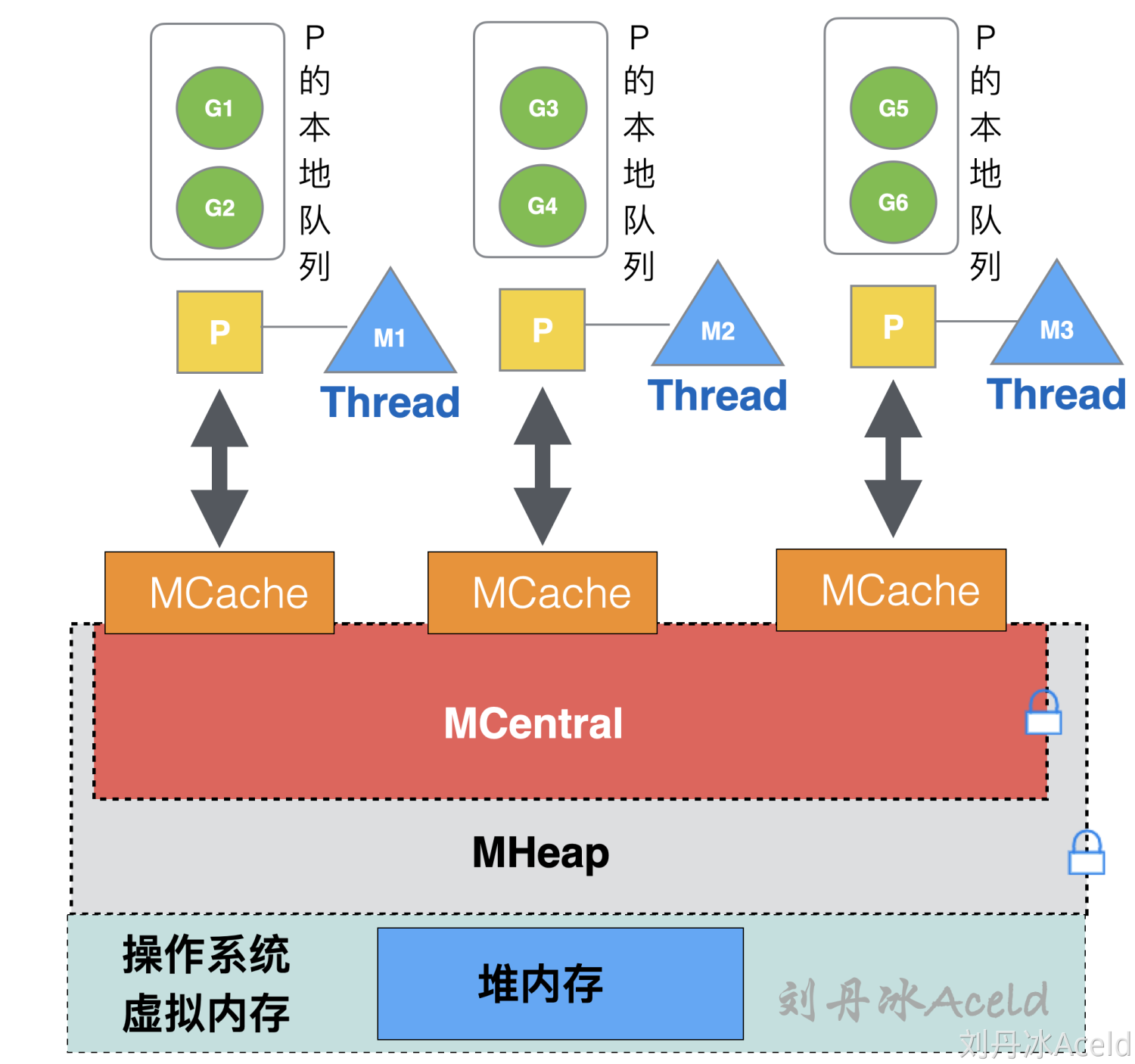 Golang内存管理模型的逻辑层次参考了TCMalloc,类比: