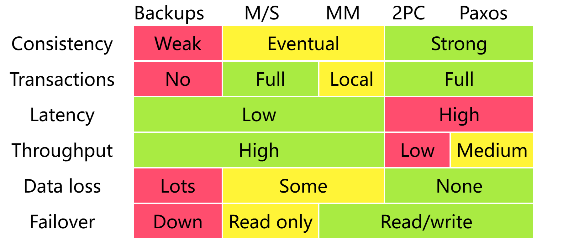Master-Slave:R in slaves and RW in master Master-Master:all nodes RW and sync Tree-Replication:combine masters and slaves as tree Buddy:B replice to C and is A's backup.