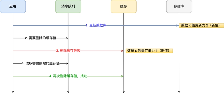如果某个操作执行失败呢?比如说删除失败,导致触发兜底造成延迟。有两种办法,目标是异步操作缓存: