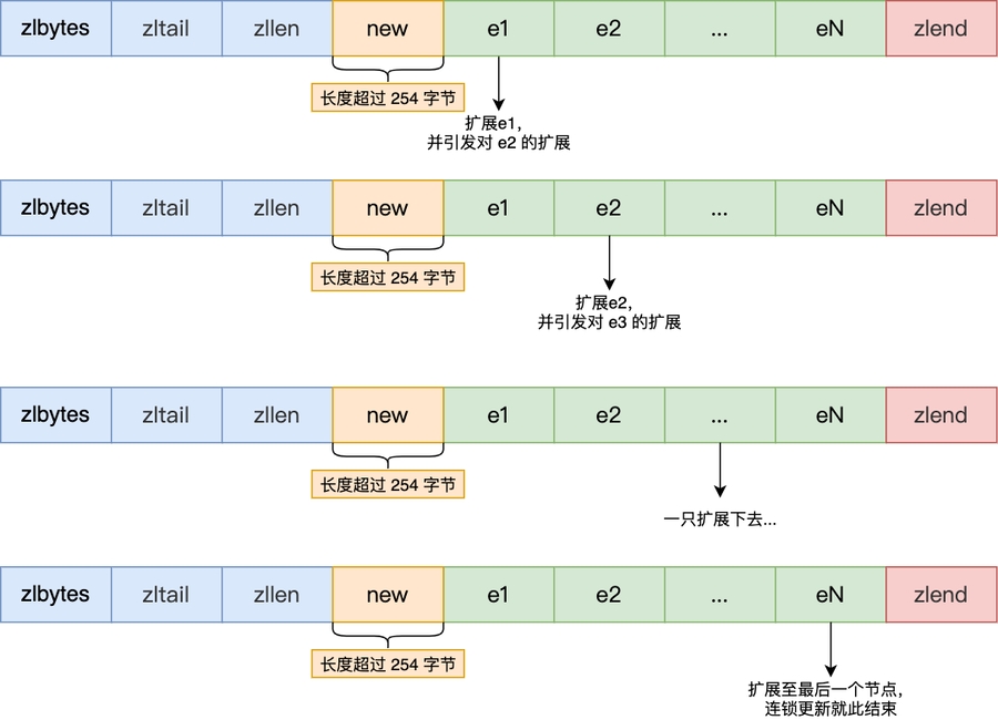 插入一个新的元素就需要调用 realloc 扩展内存。空间扩展操作也就是重新分配内存,因此连锁更新一旦发生,就会导致压缩列表占用的内存空间要多次重新分配,这就会直接影响到压缩列表的访问性能。下图是连锁更新的例子: