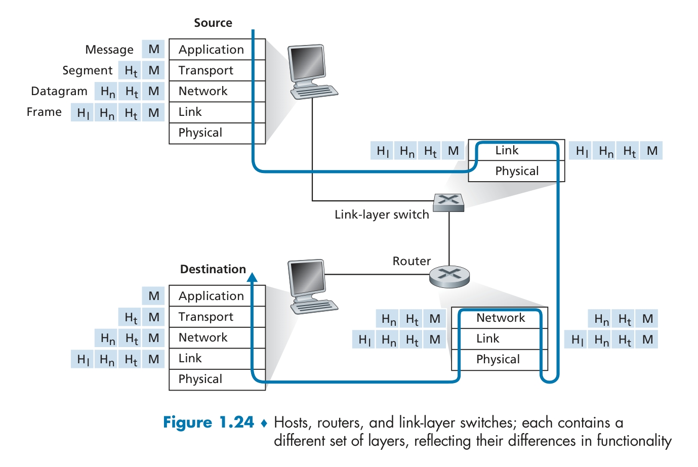 transfers datagram and transport-layer segment [Ht \ M] from one host to another