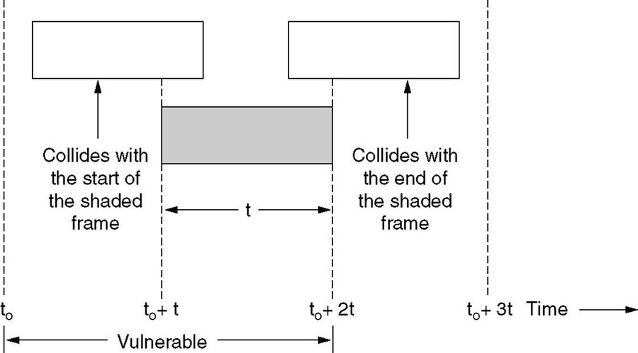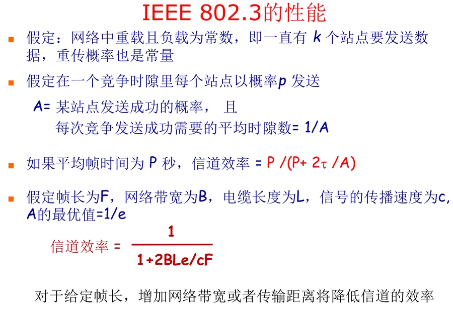 最大吞吐量(信道利用率): 18.4% 争用期为2段帧时。(只有经过争用期之后还没有检测到碰撞,才能肯定这次发送不会发生碰撞。)