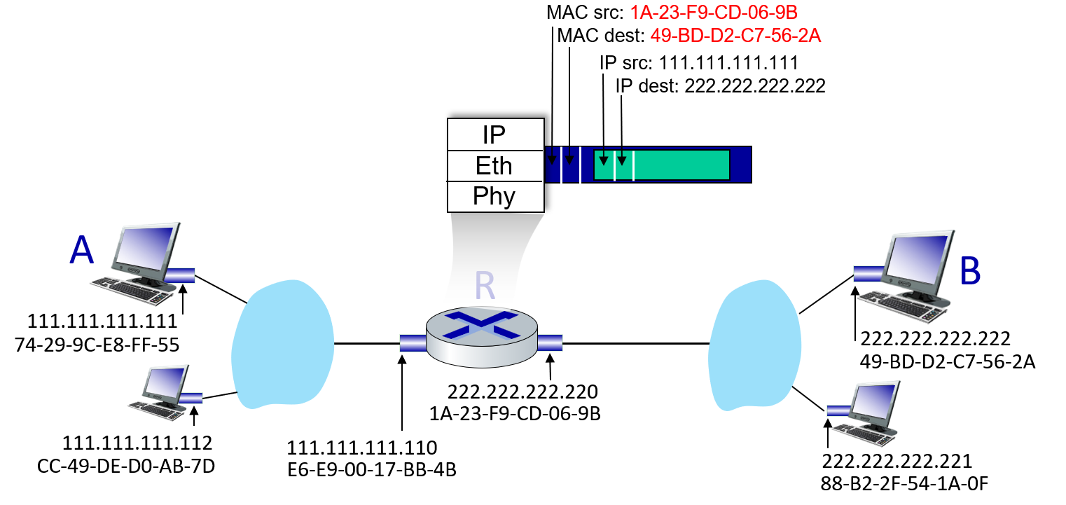 R determines outgoing interface, passes datagram with IP source A, destination B to link layer and creates link-layer frame containing A-to-B IP datagram. Frame destination address: B's MAC address
