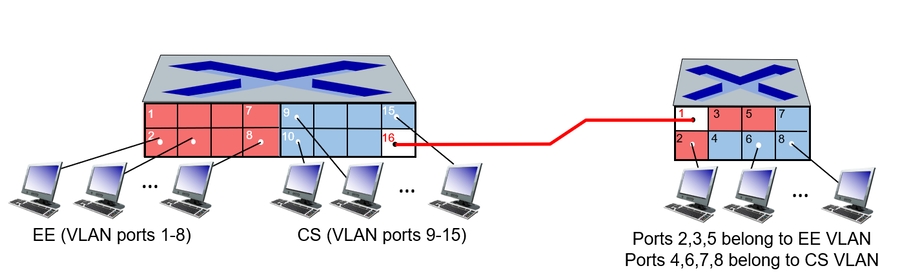 port-based VLAN: switch ports grouped (by switch management software) so that single physical switch. support traffic isolation