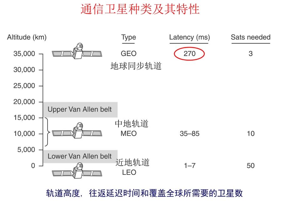 通信卫星(大型微波中继器):包含多个天线和多个转发器,转发器监听频谱中的某一部分。GEO具有较大的往返延迟时间。