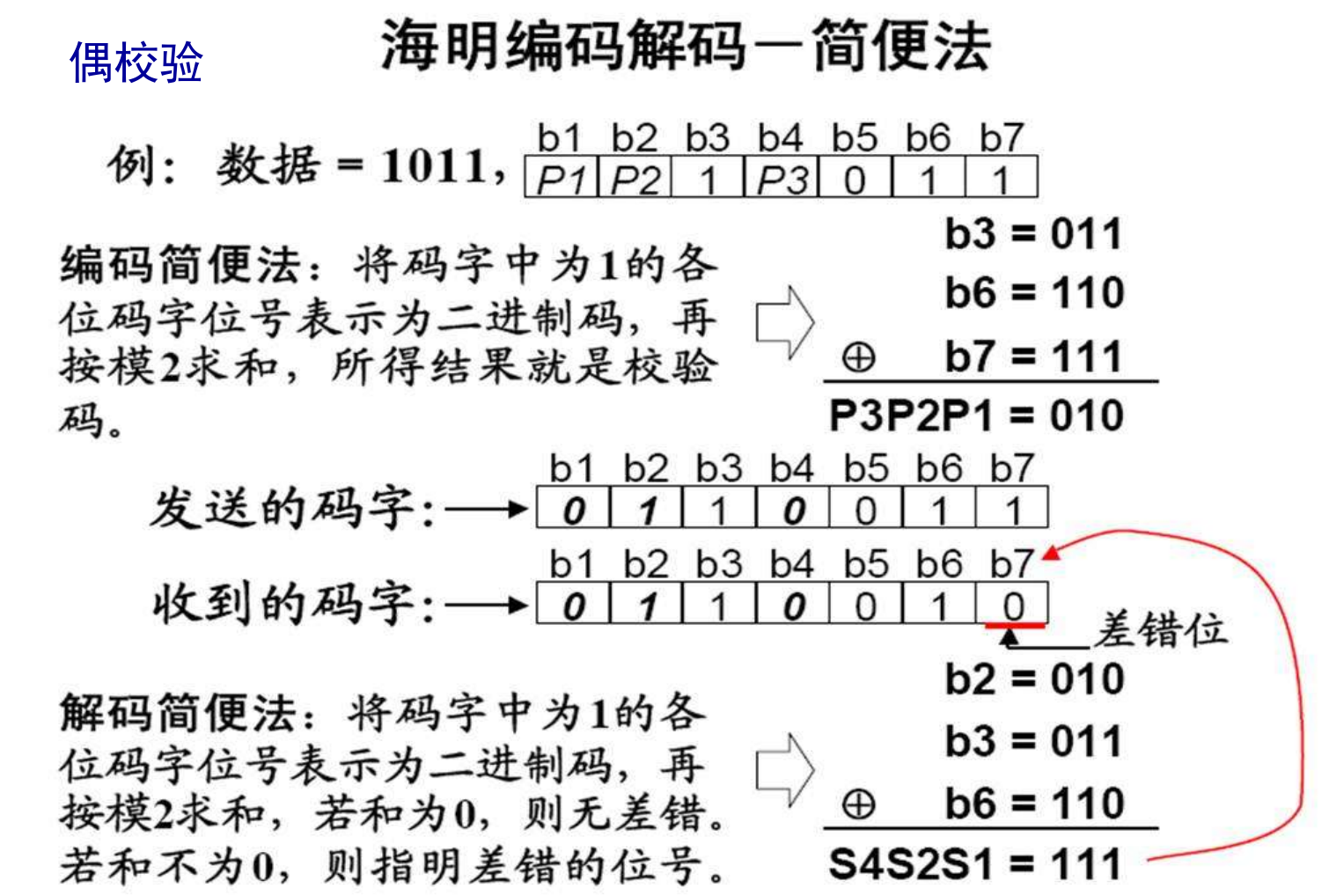 奇校验表示 $all\space data\space bits \oplus checkBit == 1$ 偶校验类似。